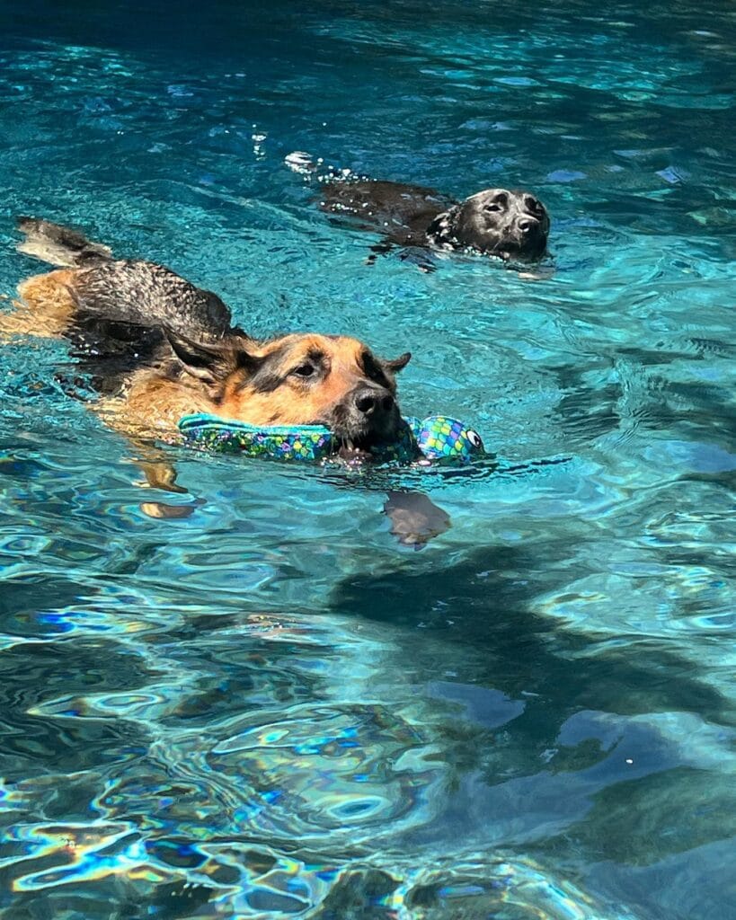 Two dogs mid-swim, one carrying a colorful fish-shaped pool toy in her mouth like she won something. That’s the energy we’re building here.
