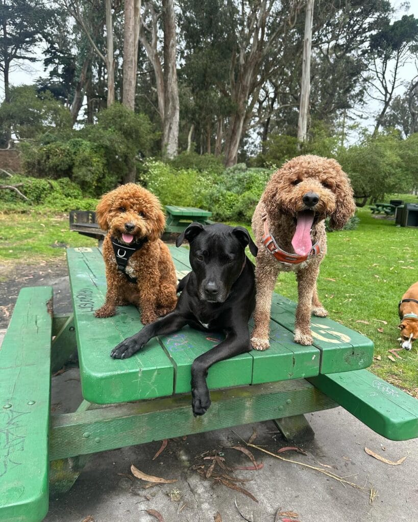 This photo gives me all the ideas. Three dogs — a mini goldendoodle, a black Lab mix, and a standard goldendoodle — just chilling on a green painted picnic table like they own the place. And the thing is, that table IS an obstacle course element hiding in plain sight.