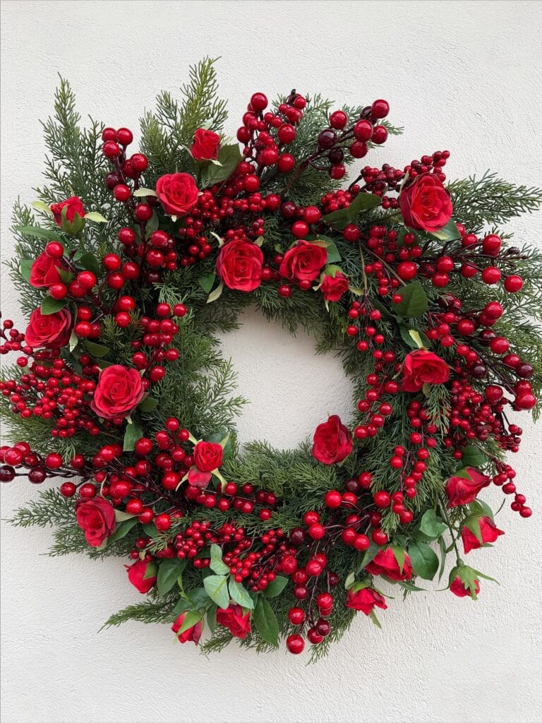 Hot-glue your red silk roses at varied heights. Tuck some low, let others pop forward. The feature is the layered dimension, the benefit is a wreath that photographs like a florist made it, and the payoff is everyone assuming you spent $200 at a boutique.