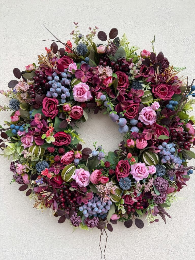 This wreath fixes that instantly. Deep burgundy roses, blueberry clusters, purple hydrangeas, dusty blue thistles — it’s moody, lush, and honestly looks like something from a high-end boutique. And the best part? You made it.