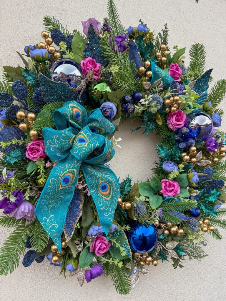For the bow — this is the moment the whole thing clicks. Use your wired peacock ribbon to make a 6-loop bow with two long tails. Wire the center tight, then fluff each loop open. Attach it at the lower-left position (around the 7 o’clock spot on the wreath), which is exactly where the eye naturally lands first. Curl the ribbon tails slightly downward.