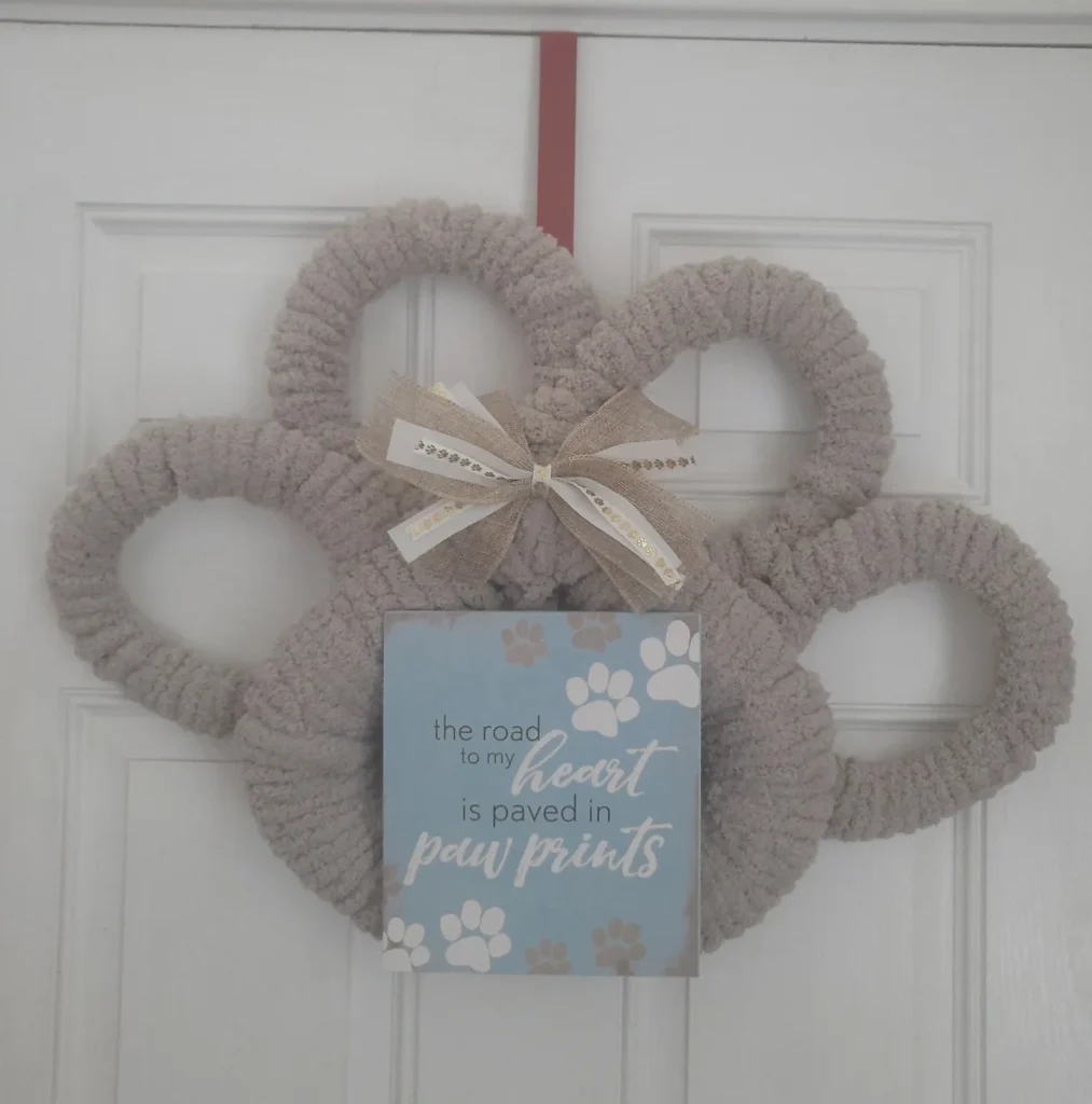 This chunky chenille yarn paw wreath is giving me all the feels. It’s shaped like a dog paw — four looped “toe” shapes surrounding one big palm loop — and it hangs right on your front door like a little love letter to your golden.