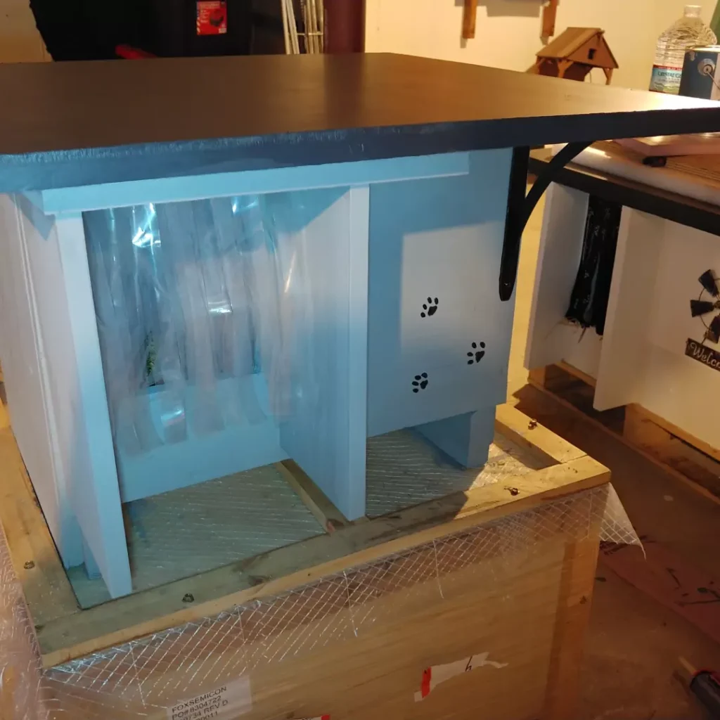 The build uses ¾-inch plywood for the walls, reflective foil insulation on the floor, and a metal grid base panel underneath for airflow. Those little black paw print decals on the interior divider wall? Such a sweet touch. The structure sits on a raw pine wood base frame with a bracket-supported flat roof — sturdy enough to double as a surface for storing supplies.