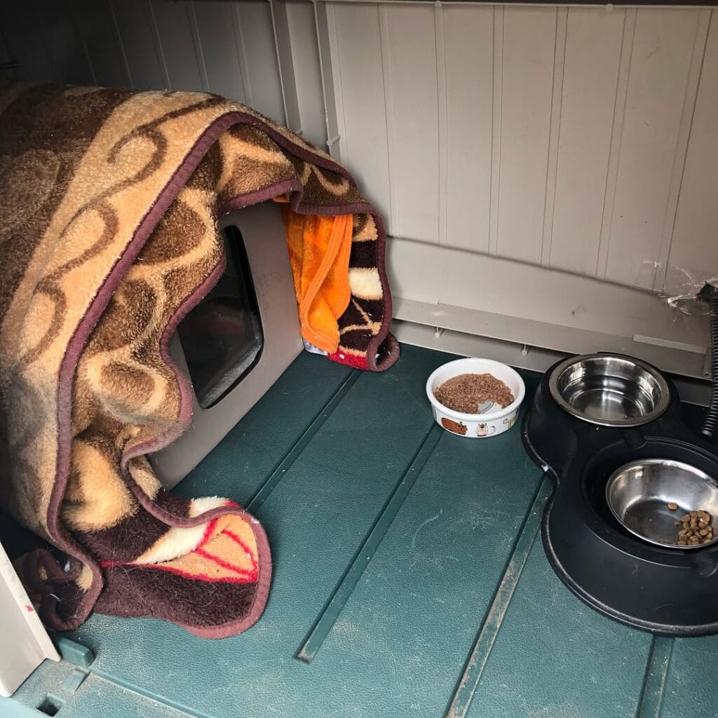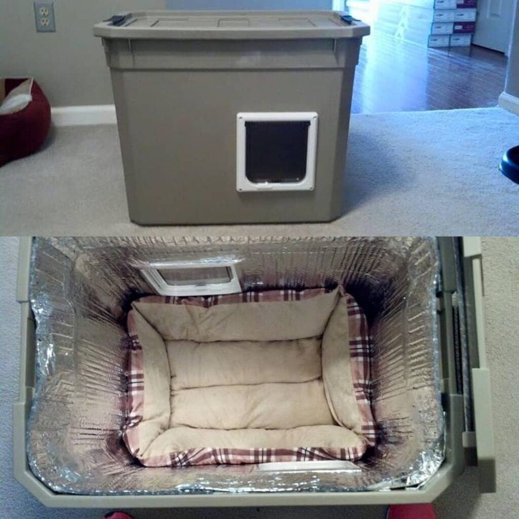 This shelter is a gray Rubbermaid storage tote with a cat flap door cut into the front — and inside, it’s lined with reflective mylar insulation and fitted with a plaid pet bed cushion.