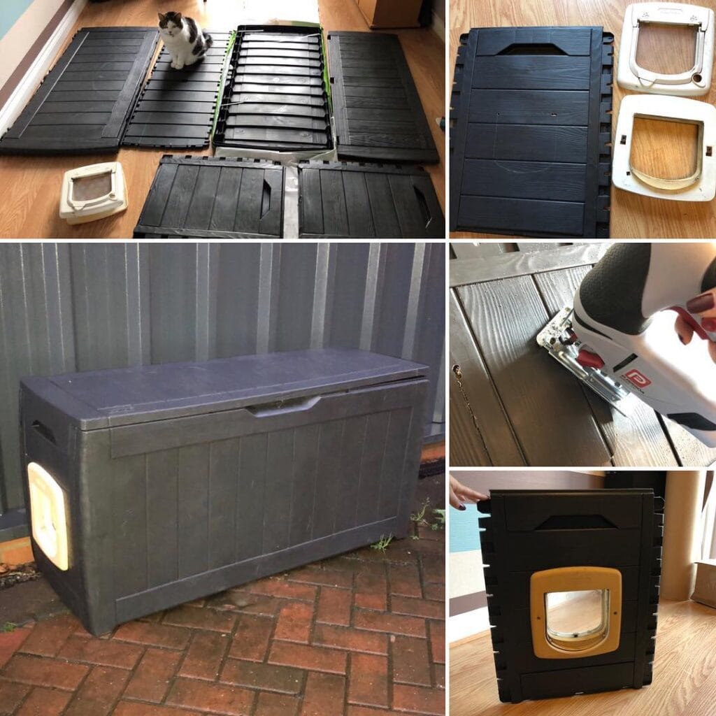 This DIY is genuinely clever. Someone took a dark gray plastic outdoor storage deck box — the kind you’d use for garden cushions — and turned it into a weather-resistant feral cat shelter with a built-in cat door flap. The wood-grain texture on the exterior gives it that Pinterest-worthy look instead of screaming “cat box” to your neighbors.