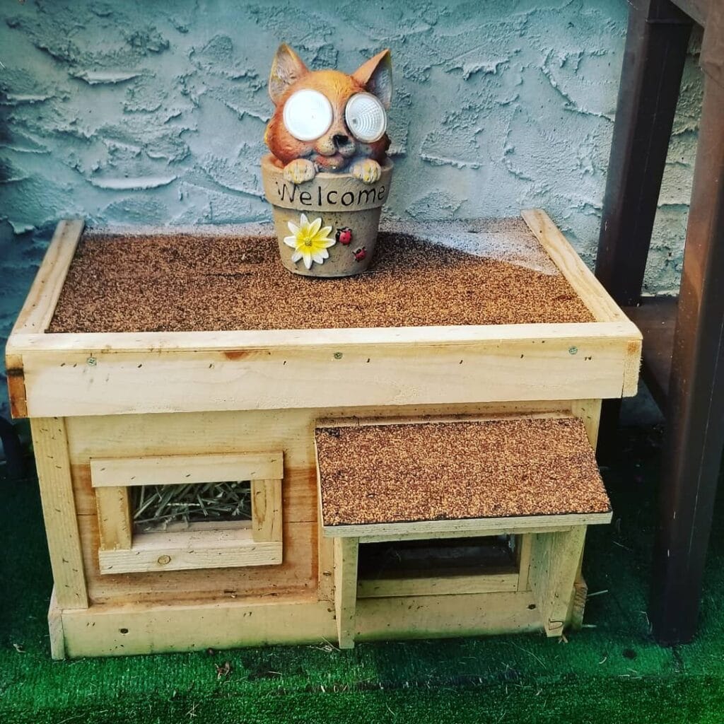To recreate this, you need untreated pine plywood panels for the main structure, cork sheet roofing (it’s waterproof and chew-resistant), and a small mesh-windowed side door for ventilation. The lower section works as a separate covered entry ramp — that design keeps rain out while giving feral cats a private entrance. And the solar-powered fox garden light sitting on top? Total personality. It’s a ceramic fox peeking out of a “Welcome” pot — the kind of detail that makes people stop and ask where you got it.