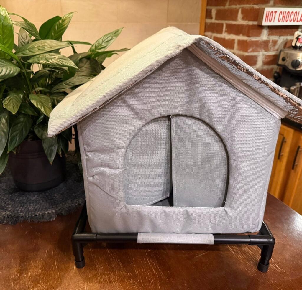 This shelter is giving me all the cozy-but-functional vibes. The gray Oxford polyester fabric exterior sits on a black PVC pipe frame that lifts the whole unit off the ground, and the peaked roof is lined with reflective mylar insulation — you can actually see it peeking out along the roofline in that copper-gold shimmer.