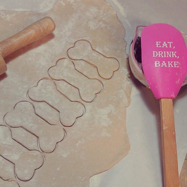 Roll the dough half-inch thick on your counter. Cut bone shapes with a cookie cutter or just slice rectangles with a knife. Place them on a baking sheet one inch apart and bake at 350°F for 20 minutes until golden brown. You’ll get 24 biscuits that store in an airtight container for two weeks.