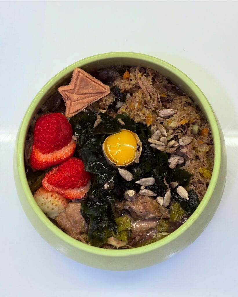 This bowl is basically a dog’s dream plate — dark leafy greens, shredded meat, a raw egg yolk sitting right in the center like a little crown, sliced strawberries, sunflower seeds, and what looks like a small fish-shaped treat on top. All served in a light green ceramic bowl that honestly looks Pinterest-worthy.
