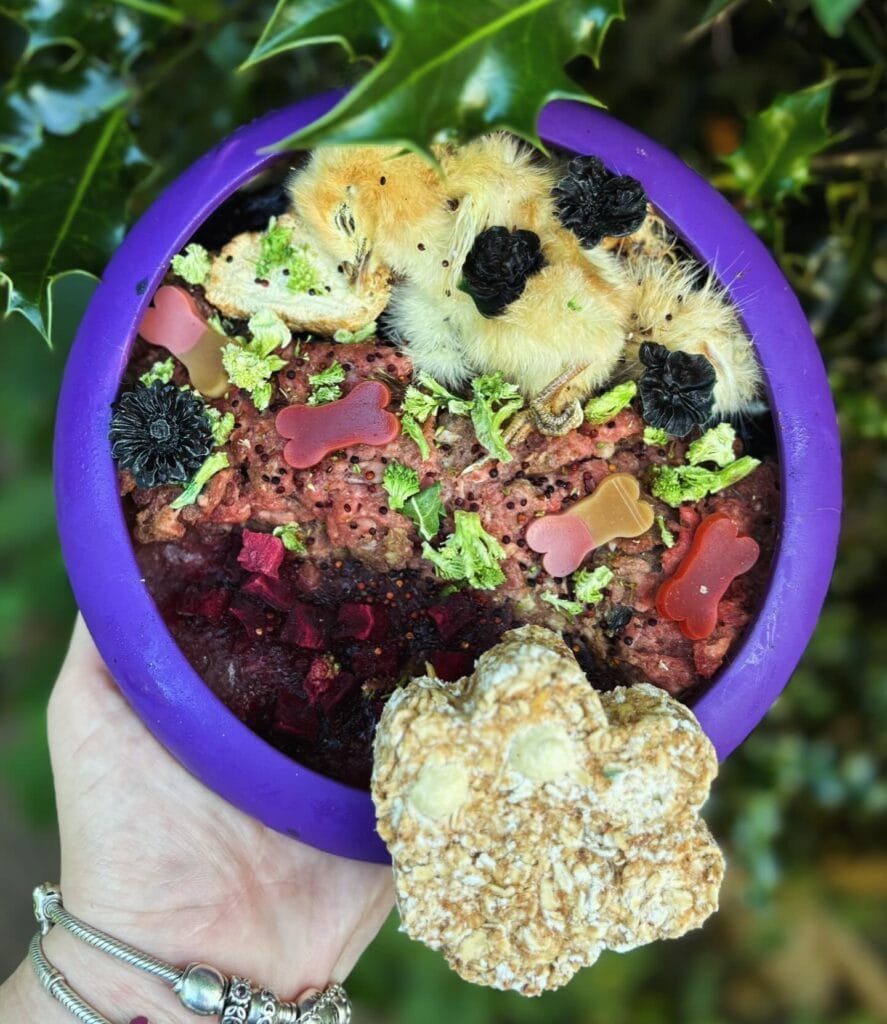#4: Raw Beef Birthday Bowl with Chick Toppers and Bone Gummies