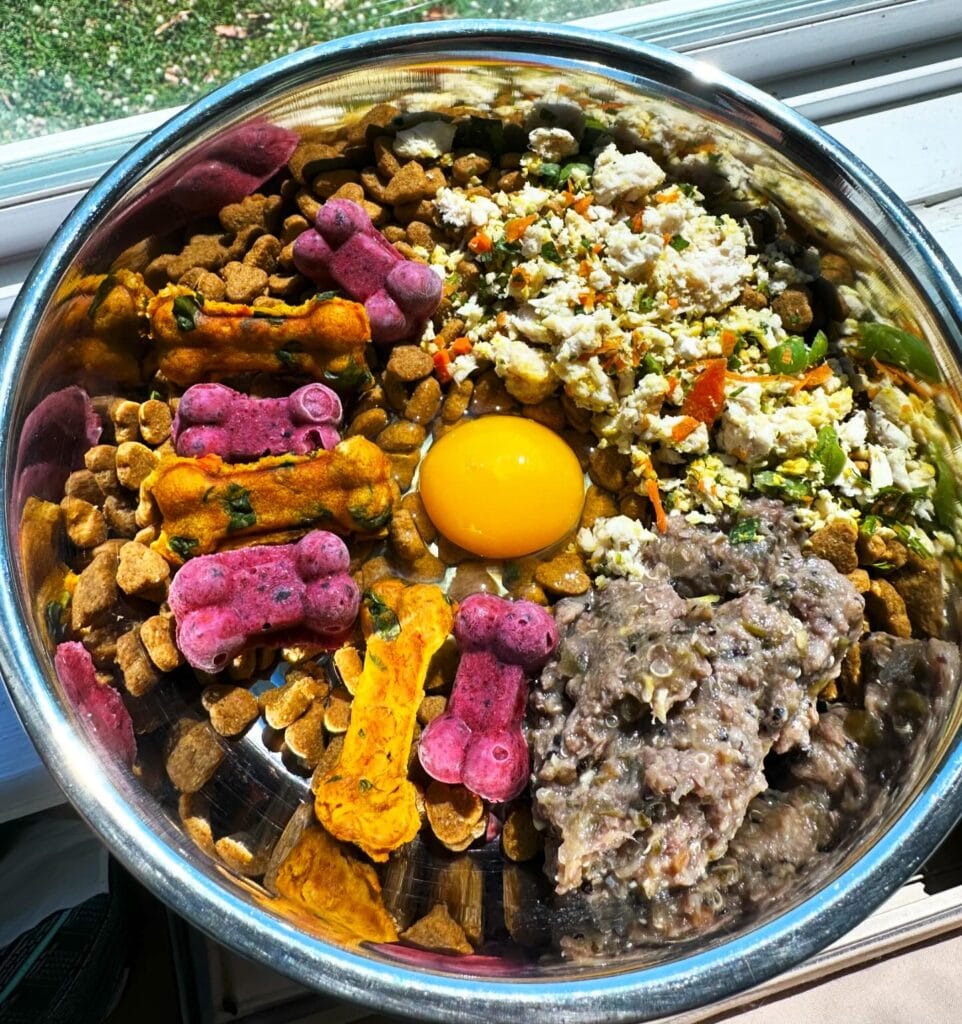 This bowl right here? It’s the real deal. A stainless steel mixing bowl packed with layers of color and texture — orange and pink bone-shaped baked treats, golden kibble, scrambled eggs with herbs and carrots, a raw egg yolk cracked right on top, and a generous portion of cooked ground meat with quinoa or oats.