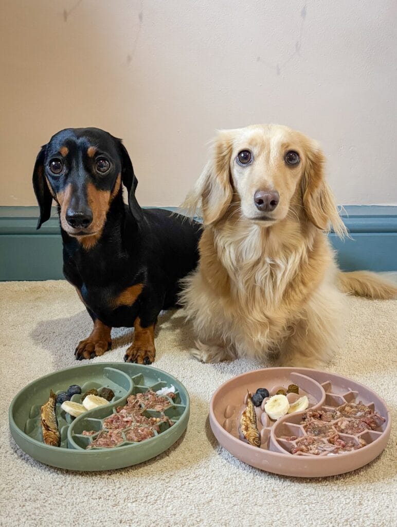 #8: Two Dachshunds, Two Slow Feeder Bowls, One Ridiculously Cute Mealtime Setup