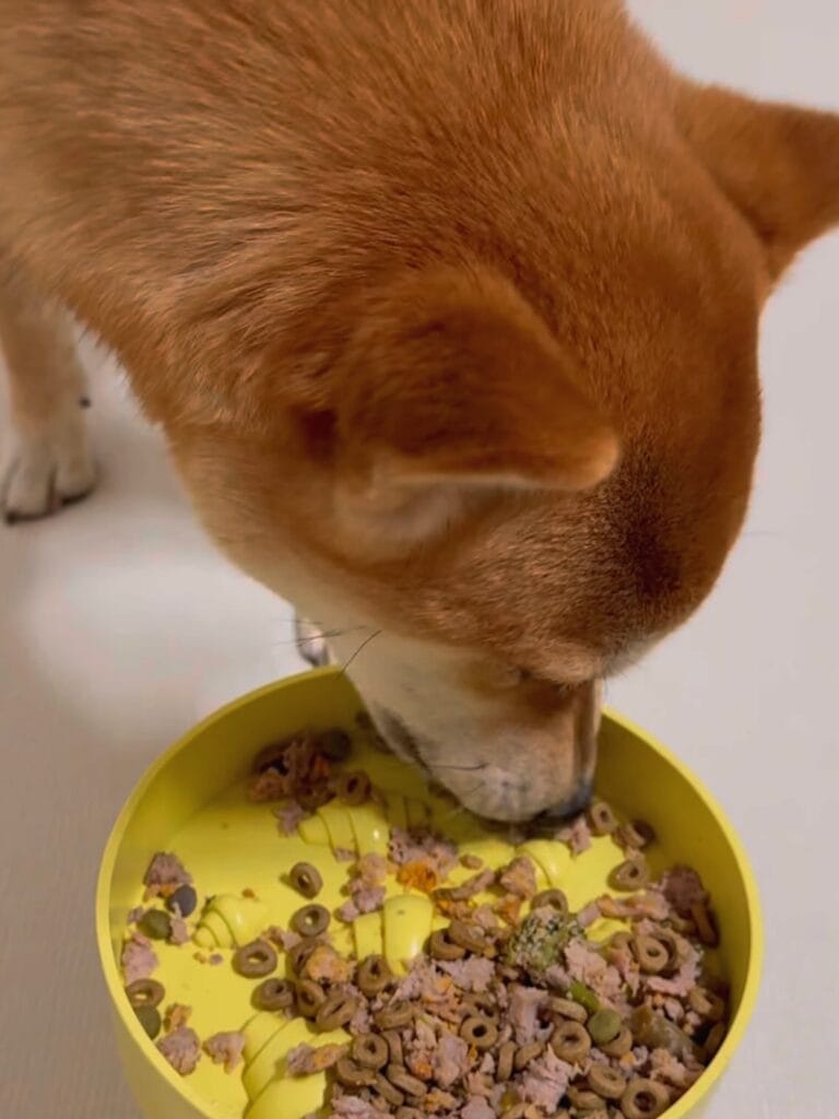This yellow slow-feeder bowl is packed with a mix of wet food, dry kibble rings, and what looks like cooked ground meat with tiny green veggie bits. It’s colorful, it smells like something she’ll actually want, and it slows her down without a fight.