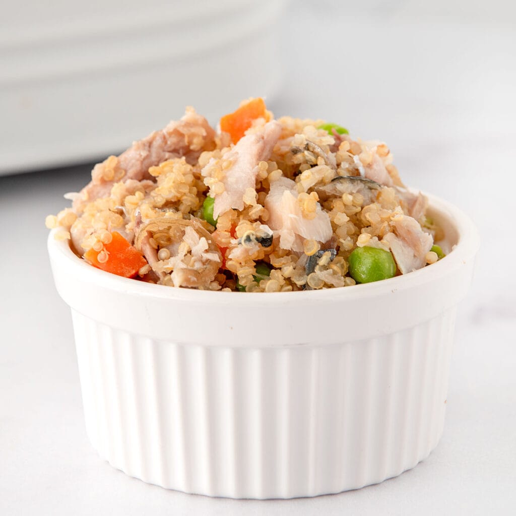 Cook your quinoa first — use a 1:2 quinoa-to-water ratio and let it simmer for about 15 minutes until fluffy. While that cools, steam the carrots until they’re fork-tender (hard chunks are a choking risk, so go soft). Mix everything together in a bowl — tuna, quinoa, peas, carrots — then add a splash of broth to bring it all together into something that actually looks good enough to eat yourself.