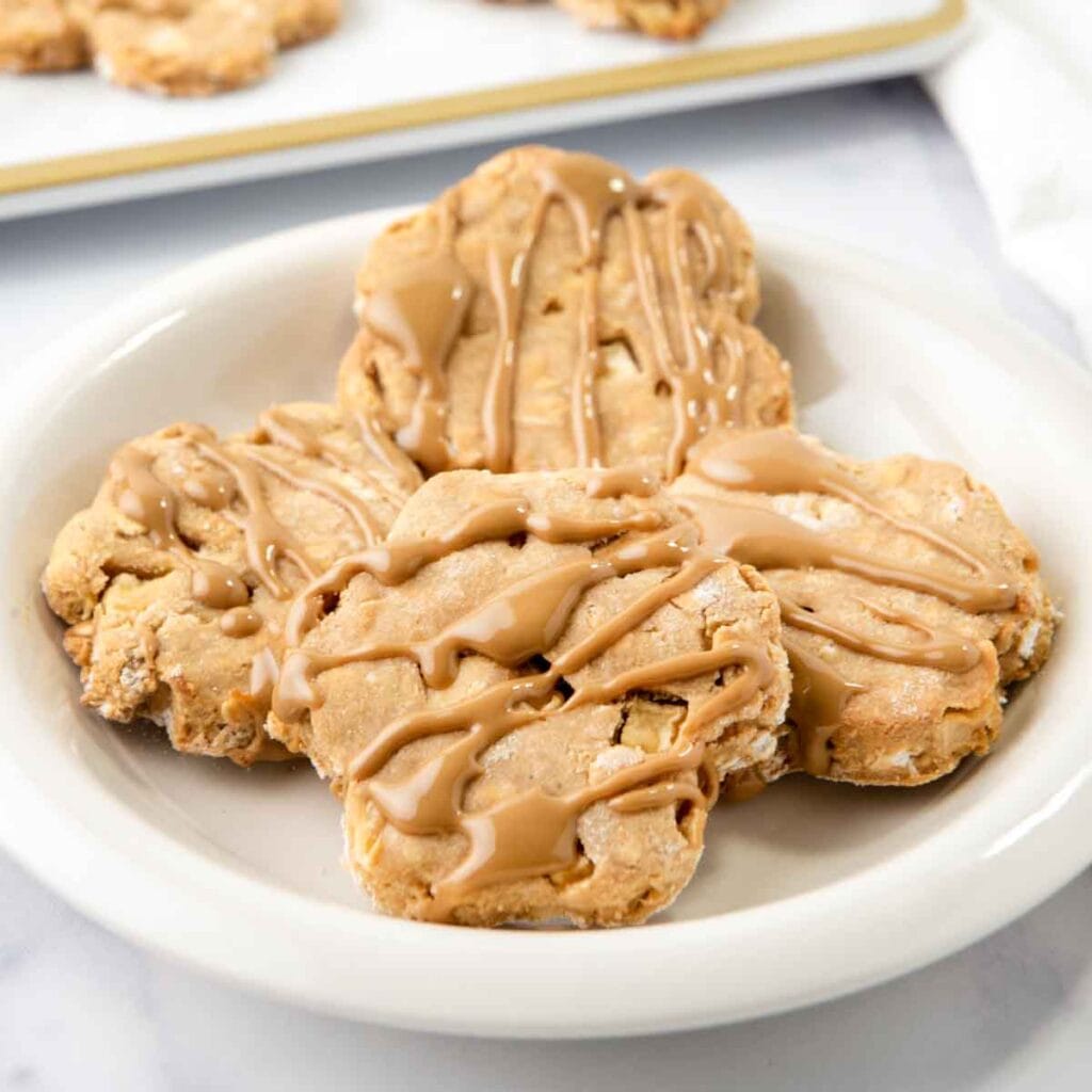 These cookies are golden-tan, slightly chunky, and drizzled with a warm peanut butter glaze that hardens just enough to make them look like something off a Pinterest board. Honestly they’re prettier than some stuff I’ve baked for myself.