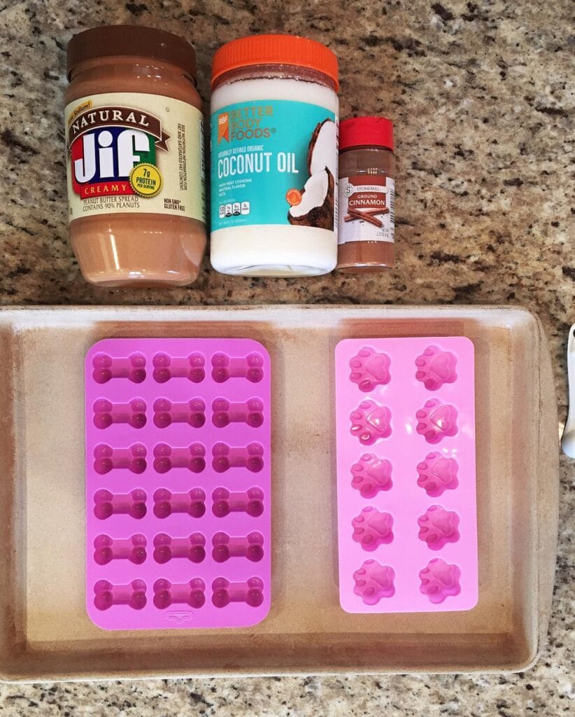 Melt your coconut oil first — just 20 seconds in the microwave does it. Stir in the peanut butter until the mixture looks smooth and pourable, then add your cinnamon and give it one more good mix. Pour into your silicone bone or paw molds and set them on a baking tray so they’re easier to move. Freeze for at least2 hours before popping them out.