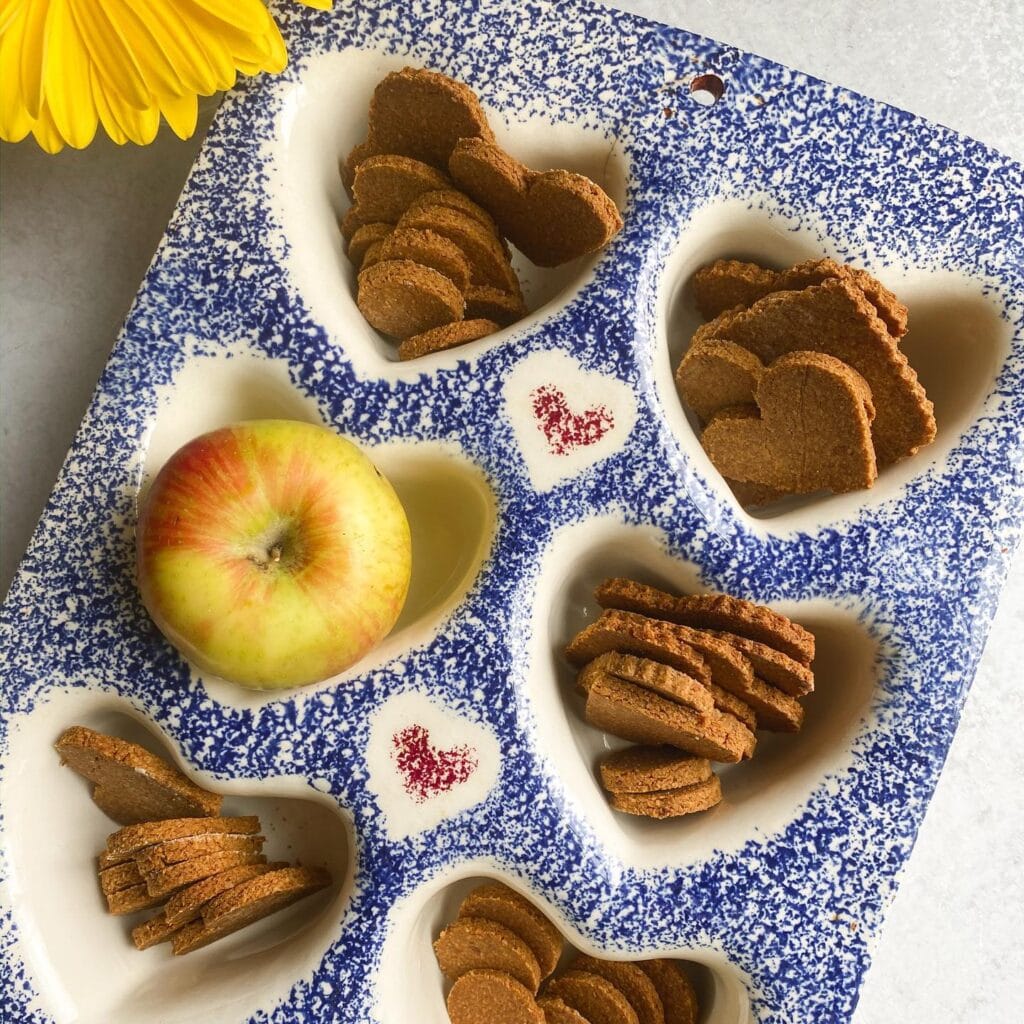 #6: Heart-Shaped Apple Cinnamon Dog Treats Baked in a Blue Speckled Pan