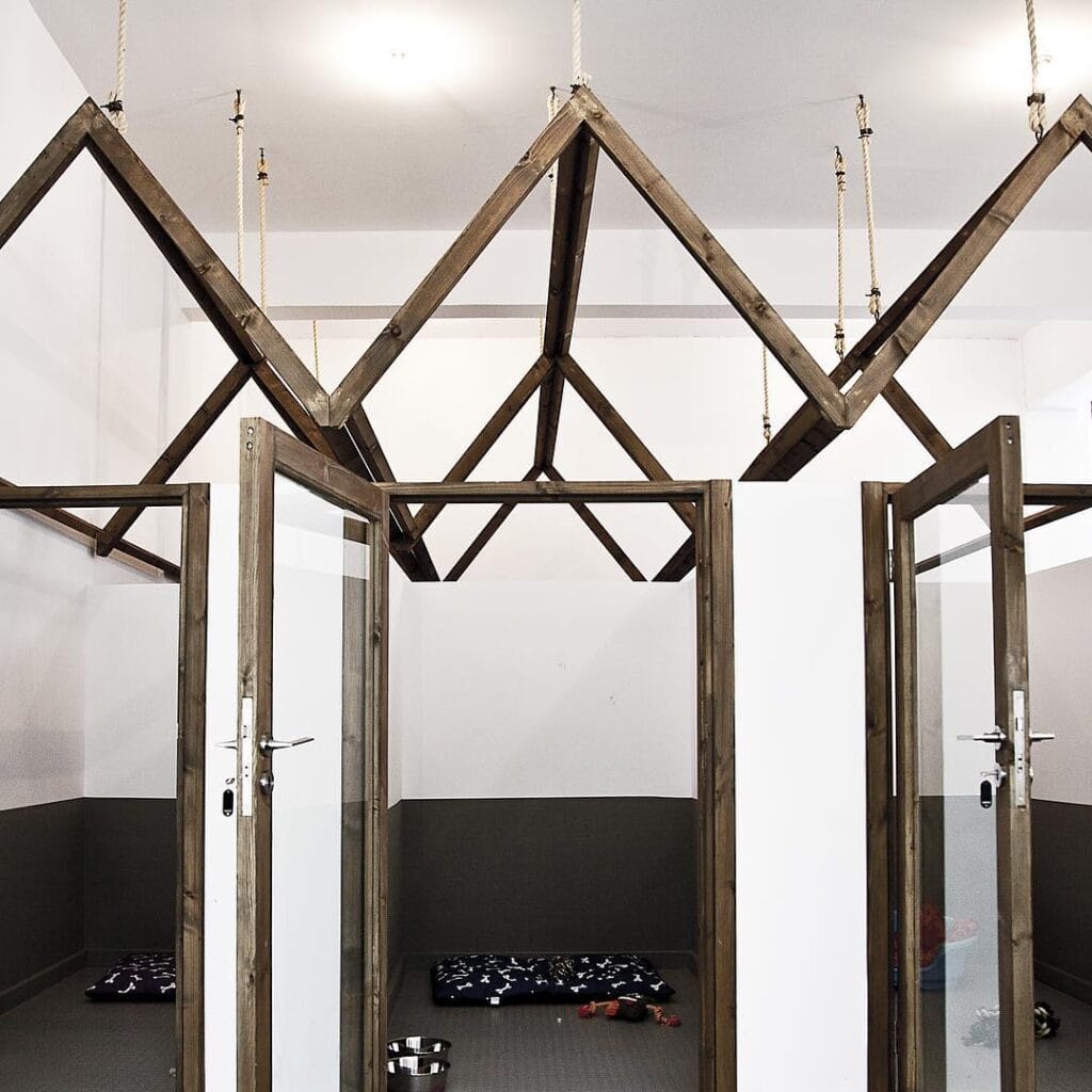 These individual suites use dark-stained pine wood frames shaped like tiny A-frame houses, suspended from the ceiling with thick natural rope and metal hardware. Each unit gets glass-paneled doors with lever handles, so dogs feel enclosed but never trapped in the dark. The bone-print navy mat on the floor and the stainless steel water bowl make it feel like a bedroom, not a holding pen.
