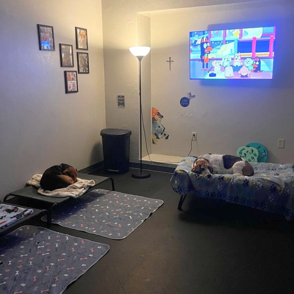 Picture dropping your golden off somewhere and actually not feeling guilty about it. No cold kennel smell. No concrete floors. Just soft beds, warm lamp light, and — I kid you not — Bluey playing on a wall-mounted TV.