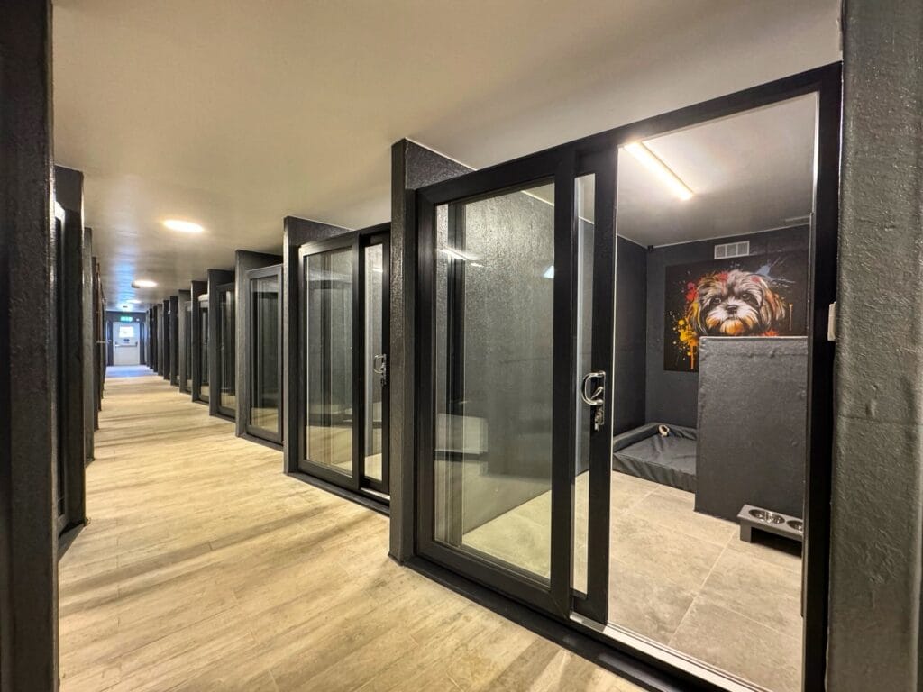 This is a full corridor of private glass-door suites, and honestly? It looks like a boutique hotel for humans, not dogs. Each suite has floor-to-ceiling sliding glass panels with black aluminum frames, grey textured wall panels, and tile flooring inside each room. The open suite on the right shows a raised dog bed platform, a double stainless steel feeding station, and a colorful dog portrait mural on the back wall — that Shih Tzu painting is everything.