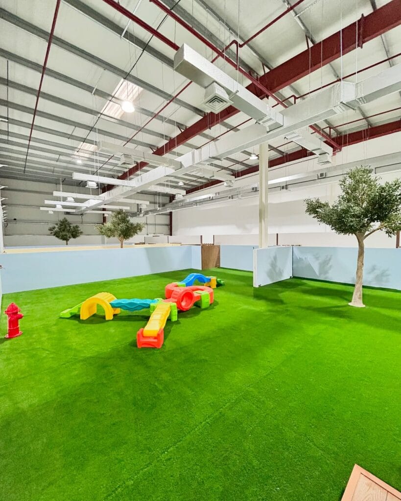 This is Asgard Dubai’s indoor play yard — and honestly, it looks like someone took a backyard and just… moved it inside. We’re talking wall-to-wall artificial turf in a deep, saturated green, enclosed by light blue paneled half-walls that give the whole space this open, airy park feel. A realistic faux olive tree sits in the corner. There’s even a tiny red fire hydrant prop tucked near the edge.