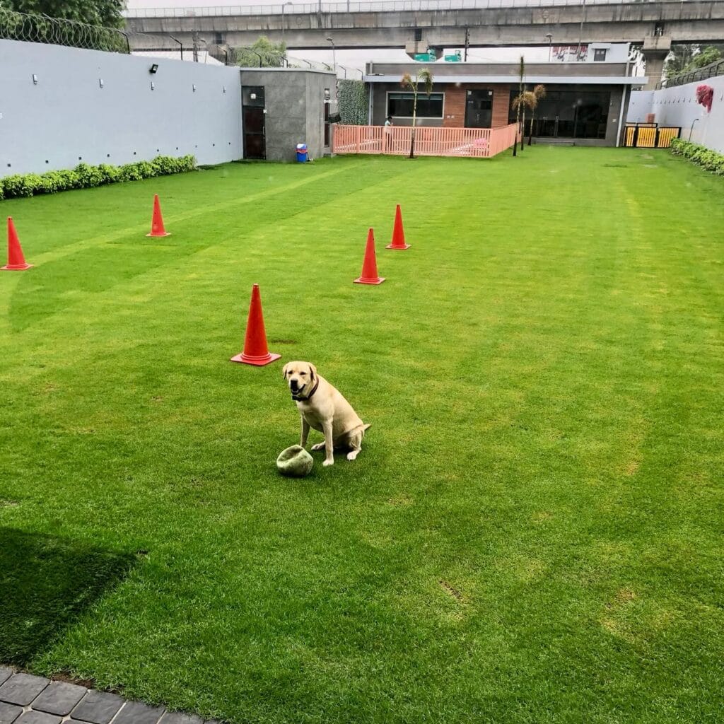 This setup features a lush green turf field surrounded by orange traffic-style agility cones arranged in a weaving pattern — the kind that gets a dog’s brain AND body working at the same time. The perimeter walls keep everything contained while a wooden-fenced lounge area sits at the far end where you (or the staff) can watch the whole show.