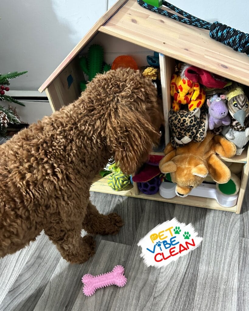 The best part: open shelving means your golden can actually pick her own toy. No digging through a bin, no dumped basket chaos — just her trotting up and grabbing what she wants like the queen she is.