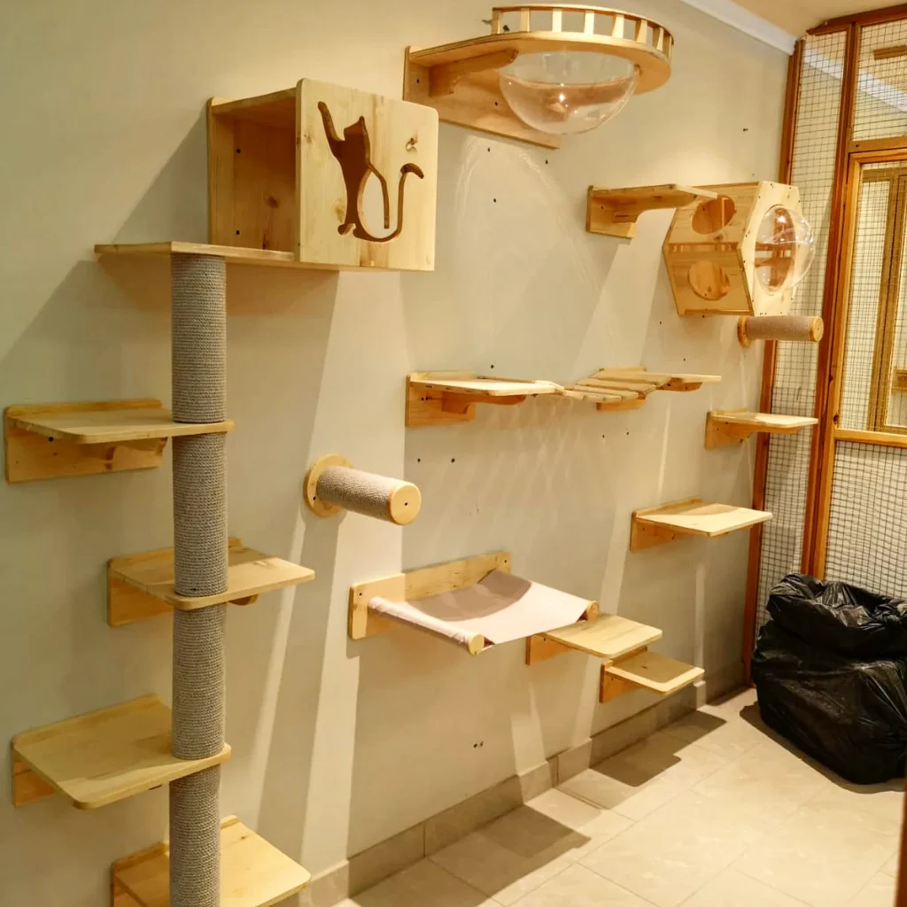 Start with wall-mounted pine shelves in staggered heights — you want them spaced roughly 12 to 16 inches apart vertically so cats can step up without jumping too hard. Add a floor-to-ceiling sisal scratch post anchored at both ends, which gives cats a full-body stretch and keeps them off your furniture. The acrylic bubble pod mounts near the ceiling and works as a lookout perch — cats love high vantage points, and it keeps them mentally engaged all day.