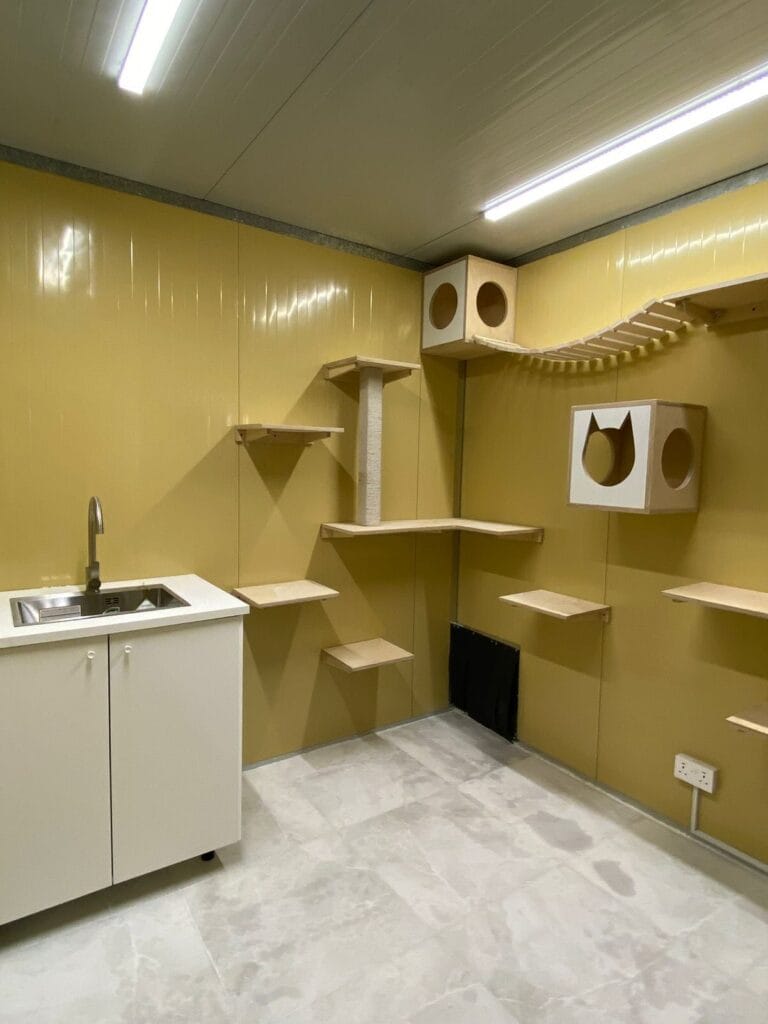 The wall-mounted sisal rope scratch post sits at the center of the climbing system — this is the main trunk cats push off from. Pair that with L-shaped corner platforms, a slatted rope bridge connecting the two walls near the top, and two wooden hideout cubes (one with circular holes, one with a cat-ear cutout in white) and you’ve got a full vertical world. The white base cabinet with a stainless steel sink on the left keeps grooming and feeding in the same room — no running back and forth.