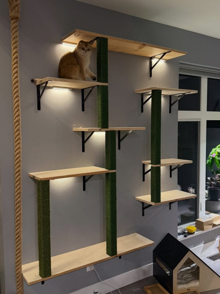 Space your shelves in a staggered staircase pattern rather than straight rows — cats need that diagonal path to actually climb, not just jump shelf to shelf. If you want more outdoor-inspired builds like this, 7 Secure DIY Cat Enclosure Ideas for Outdoors has some solid inspiration for taking the whole concept outside.