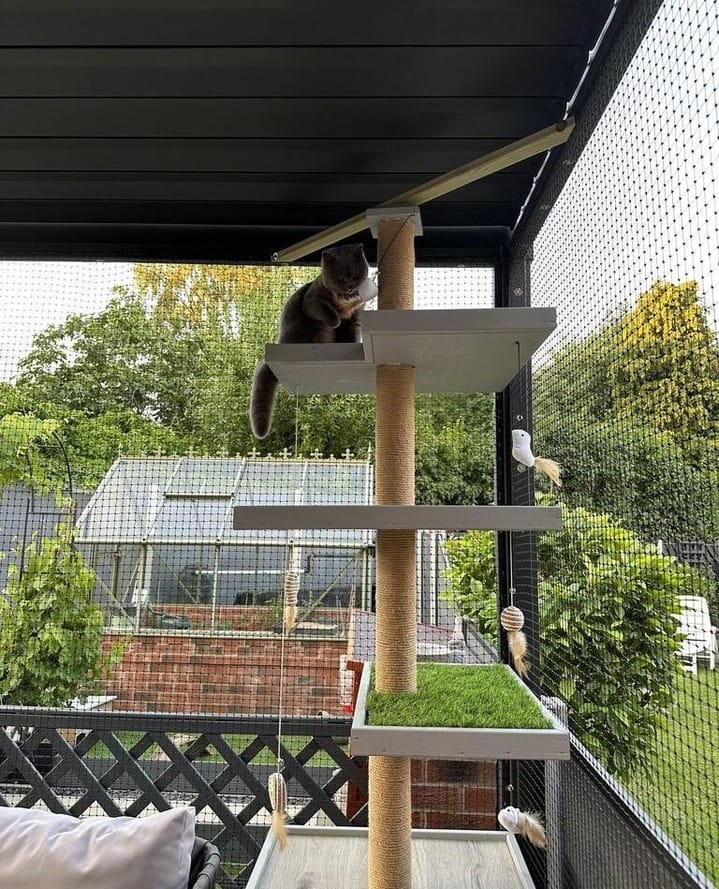 Okay so this one stopped me mid-scroll and I genuinely had to send it to my cousin who has three cats. It’s giving everything — a full outdoor enclosure with black mesh panels, lush garden views, and a tall multi-level cat tree that goes all the way up to the ceiling. The whole setup feels like a tiny luxury resort for cats, and honestly? It’s the kind of thing you pin and then actually build.
