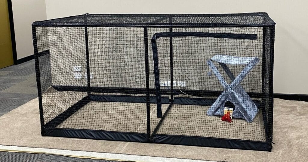The setup features a large rectangular mesh cage built from a powder-coated steel frame wrapped in fine black netting. Inside, there’s a mid-level platform shelf running along the left wall — cats love that elevated perch for watching everything below. The standout piece is that X-shaped hideaway tunnel in gray fabric, sitting right on the sandy-beige base mat. And that little pop of red near the tunnel entrance? That’s a dangling toy keeping things playful.