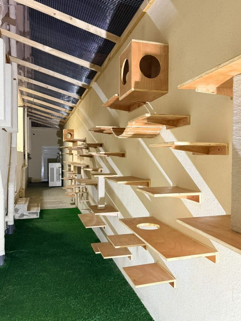 Size your shelf at exactlyhalf the enclosure’s width so your cat has room to turn around comfortably. That shelf-to-space ratio keeps cats moving instead of just sitting — which means less destructive behavior when they’re back inside your home.