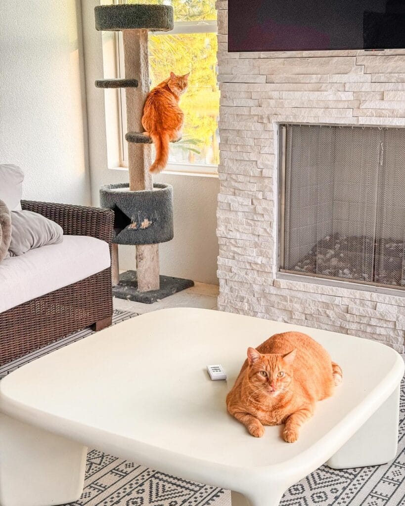 The white concrete-finish coffee table is low and wide — perfect for a chunky cat to stretch out on without knocking things over. Pair it with a woven rattan sofa with gray cushions to keep the neutral palette going. The stacked stone fireplace in cream and white ties the whole room together without competing with the cats’ ginger color pop.