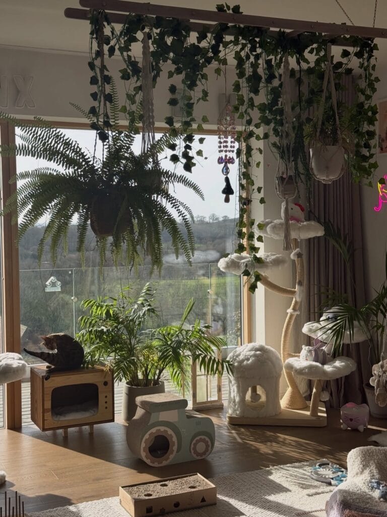 Okay so picture this — you walk into your living room and your golden has already claimed the sunny spot by the window, but your cats? They’re living their absolute best life up in this lush, layered plant situation that honestly looks like something straight out of a Pinterest board you’ve saved seventeen times.