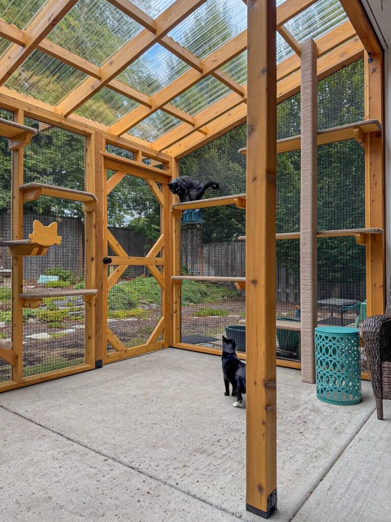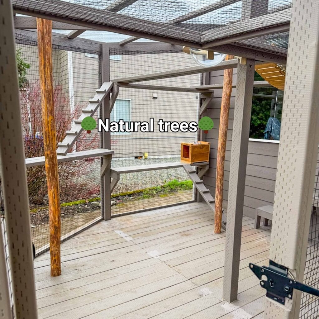 Two raw cedar log columns anchor the entire structure here, bark still on, warm amber tones running through them. They’re not decorative — they’re load-bearing, which means your cats get something to claw, climb, and scent-mark while the whole enclosure stays structurally solid.