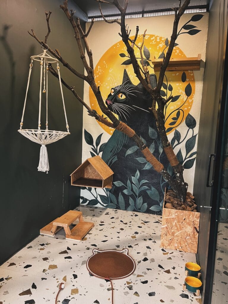 Okay, so picture this — you walk into a cat room and there’s a massive hand-painted black cat staring back at you from the wall, framed by a golden sun and dark botanical leaves. It’s moody, it’s artsy, and honestly? It hits different. This isn’t your average cat enclosure. It’s got real tree branches, a macramé hanging basket, and terrazzo floors — the whole thing looks like it belongs on a Pinterest board you’ve been saving to for two years.