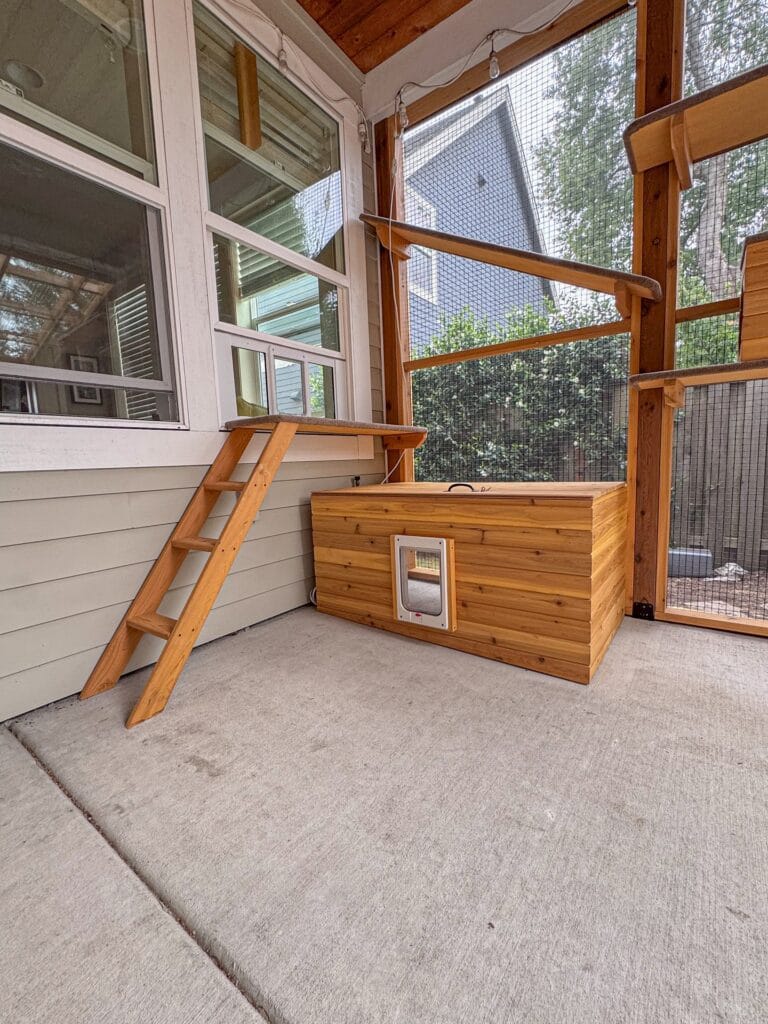 Okay, so picture this — you’re sipping your morning coffee on the screened porch, and instead of your golden pushing her nose through the door for the hundredth time, your cat has her own private entrance. That’s exactly the energy this setup gives. It’s a cedar wood catio box tucked right against the house wall, with a small pet door built into the front panel and a wooden ramp with steps leaning against the window for entry access.