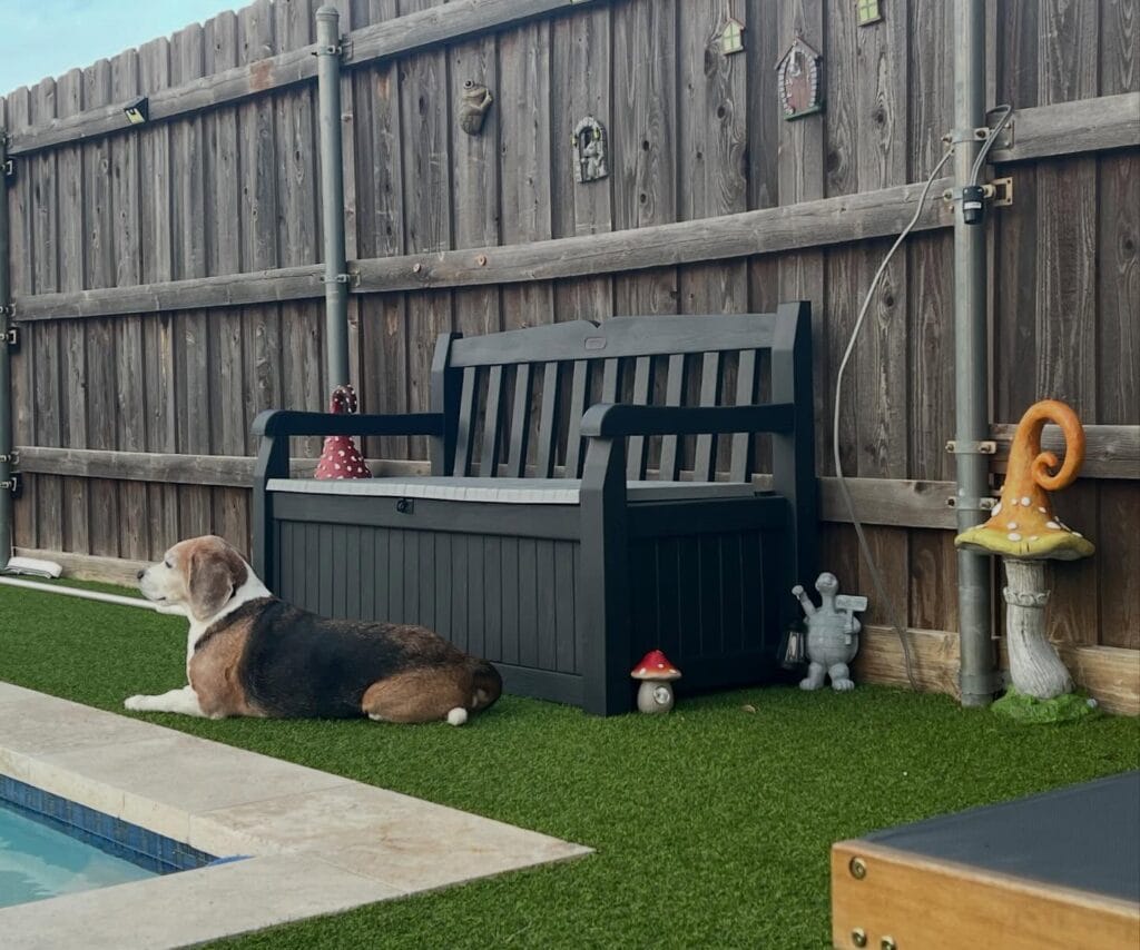 A dark charcoal resin storage bench sits flush against a weathered wood fence, giving you hidden toy storage while doubling as actual seating. The artificial turf keeps paws clean and cool, and those whimsical mushroom garden statues scattered around make the whole corner look like a Pinterest board came to life.