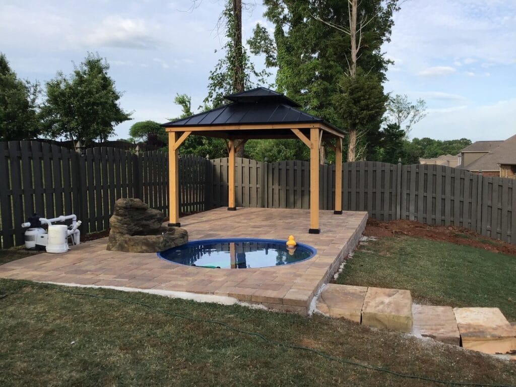 This setup solves exactly that. A circular fiberglass plunge pool sits flush into a tumbled concrete paver patio, topped with a 10×10 cedar gazebo rocking a double-tiered metal roof in matte black. Dogs get a splash zone, you get shade. Everyone wins.