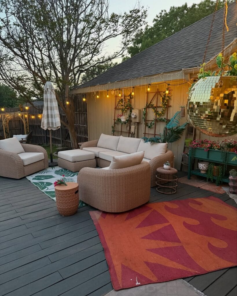 To recreate this, start with a gray composite deck — it resists scratches better than treated wood. Add a wicker sectional sofa with removable, washable cream cushions. Layer two outdoor rugs: a monstera-leaf print and a burnt orange geometric rug for visual texture. A teal wooden shelving unit with potted flowers pulls the whole boho look together. The hanging disco ball is the unexpected touch that makes it feel alive.