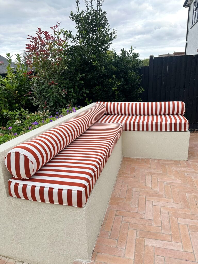 This corner setup is giving full Mediterranean courtyard energy — a cement-rendered L-shaped bench built directly into the patio wall, topped with terracotta-toned brick pavers in a herringbone pattern underneath. The star? Thick bolster-style cushions in red and white stripe, made from UV-resistant, waterproof outdoor fabric — the kind that wipes clean when your dog decides to shake off after her water bowl adventure.