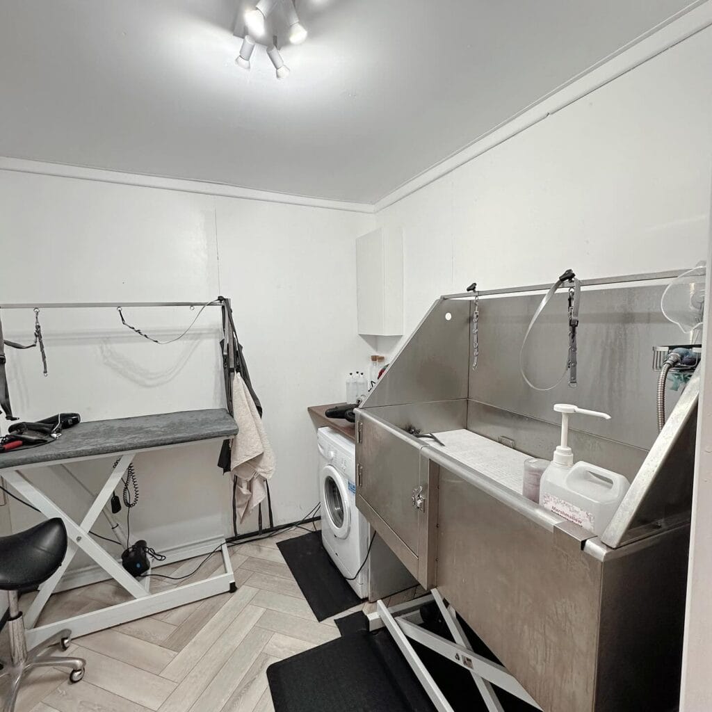 The drain grates built into the floor tile? Genius. No standing water, no slipping. And if you’re setting up a home grooming corner, a DIY dog grooming table can replicate this professional setup without the full salon price tag.