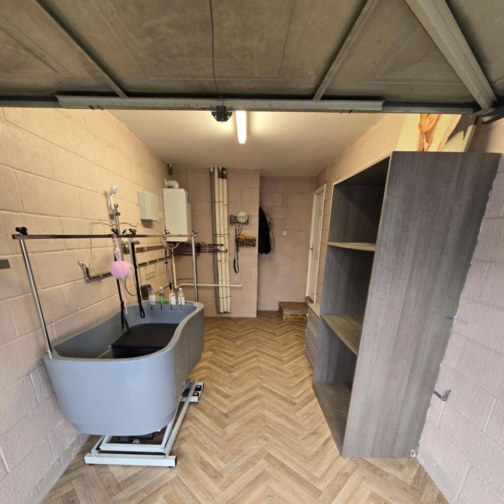 This grooming room is giving serious spa-meets-workshop energy. A hydraulic lift dog bath in cool gray sits center stage on a herringbone LVP floor, surrounded by chrome restraint arms and built-in shampoo bottle holders. Your dog stays calm, you stay dry. Win-win.