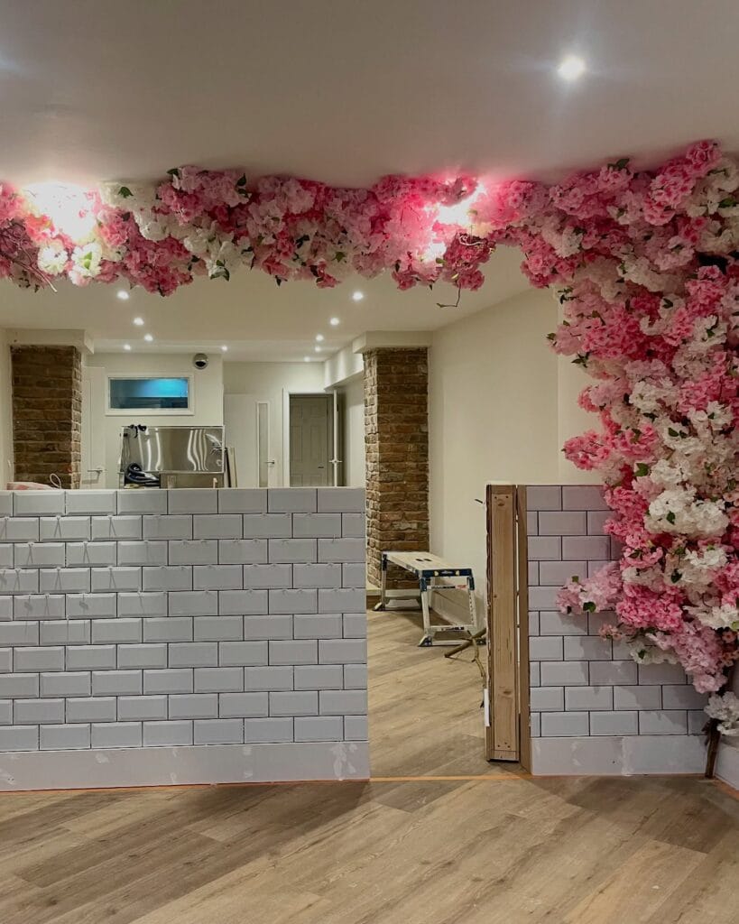 Pink and white faux cherry blossoms cascade from the ceiling and spill down the wall like a waterfall, paired with white subway tile wainscoting and light oak LVP flooring. It’s Pinterest-perfect and functional.