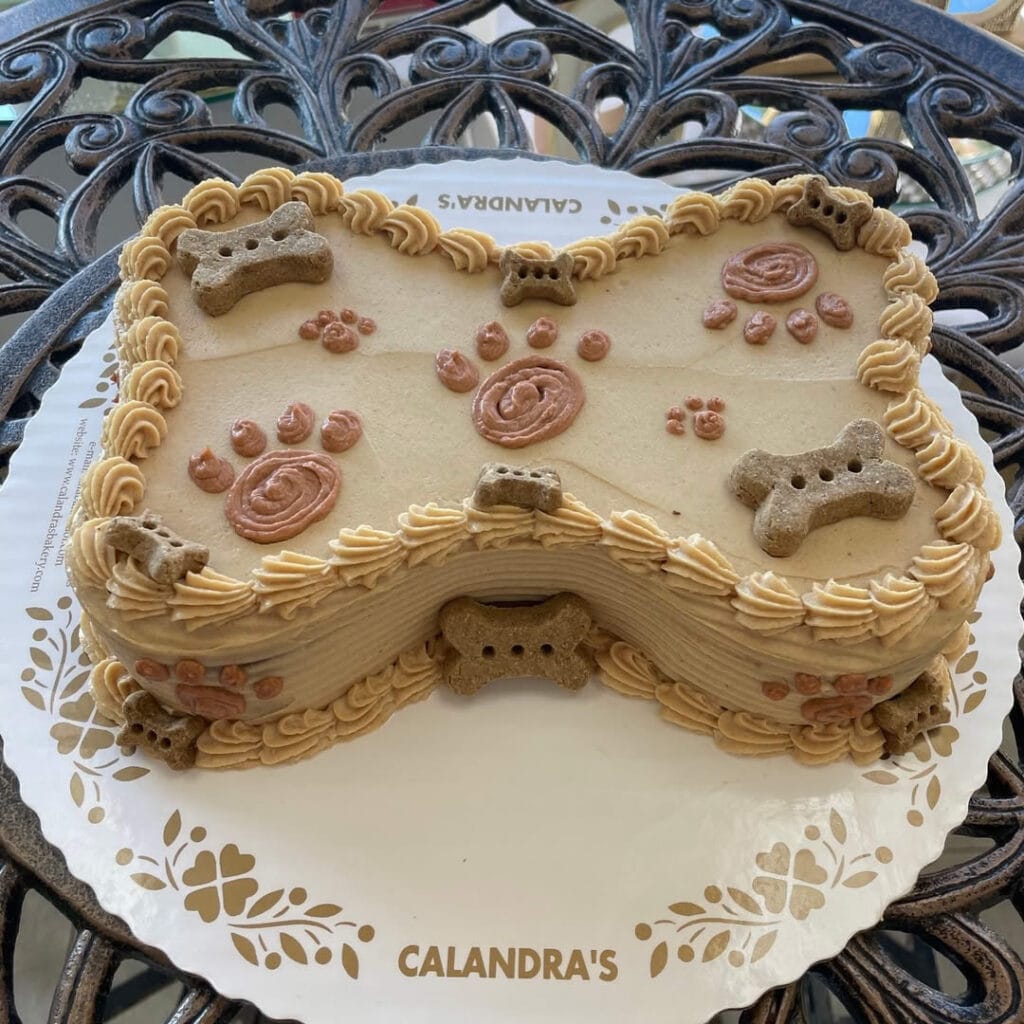 This 3-ingredient peanut butter dog cake from Calandra’s Bakery is the Pinterest moment you didn’t know you needed. It’s shaped like a dog bone, frosted in warm tan buttercream, and topped with mini bone-shaped dog biscuits pressed right into the sides and top. Those little pink paw print swirls piped across the surface? Chef’s kiss.