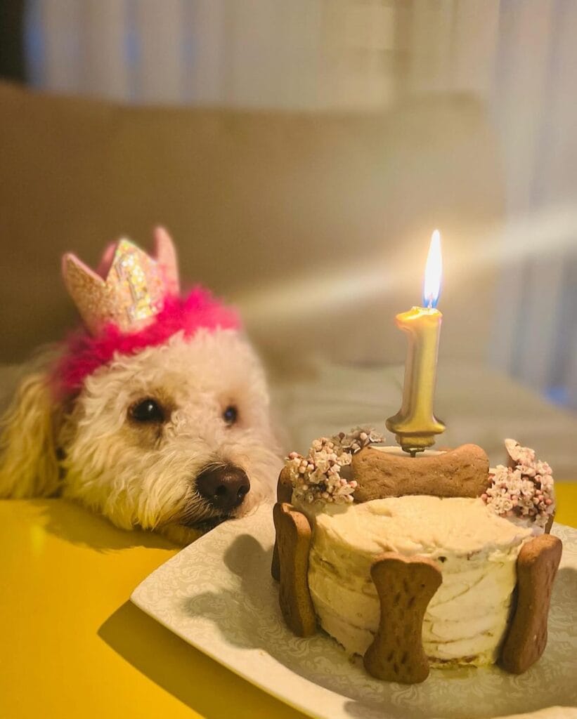 Your golden is staring at your birthday cake again. That look — the one where she’s absolutely convinced this party is for her too.