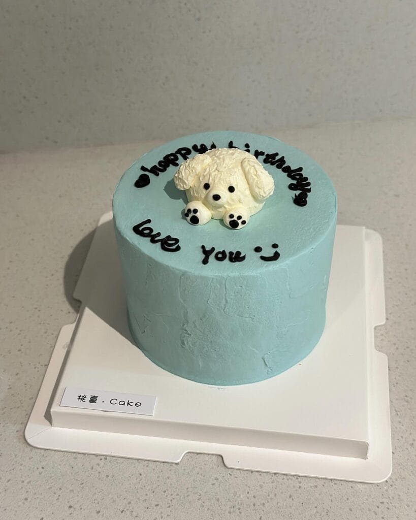 This baby blue dream from 桃喜 Cake is giving everything. A light teal buttercream base, textured sides that look like a spa treatment, and a sculpted white cream cheese poodle figure sitting right on top with tiny black fondant paw pads and eyes. It’s genuinely the cutest thing I’ve ever seen on a cake board.