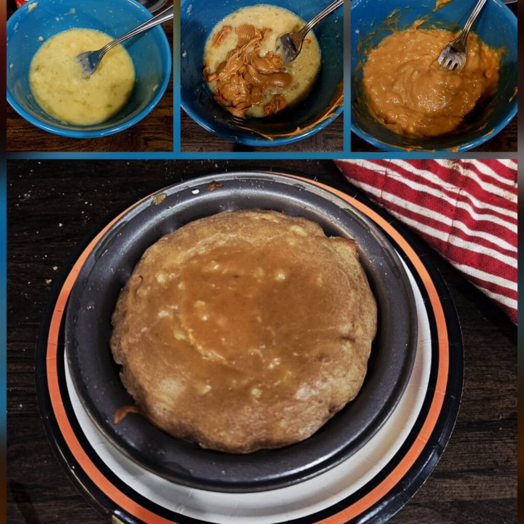 Mix all three in a bowl with a fork for 2 minutes, pour into a greased 8-inch round pan, bake at 350°F for 25 minutes. It domes slightly in the center and smells like fresh banana bread mixed with roasted peanuts—your kitchen will smell incredible for 3 hours afterward.