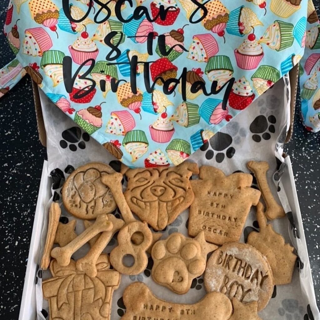 These cookies from the photo are everything — bone shapes, a dog face stamp, “Birthday Boy” rounds, and a custom message cookie that says Happy 8th Birthday Oscar. They come packed in a paw print box with a cupcake-print bandana on top. Honestly, the whole setup looks Pinterest-ready.